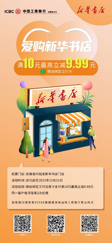 ![]() 新華書店 即日起至12月31日,工銀信用卡持卡人在新華書店指定門店使用微信綁定工商銀行信用卡支付時,有機會可享受滿10元最高立減9.99元。