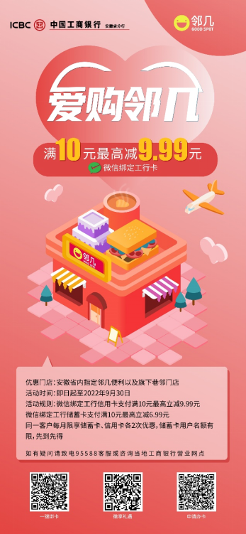 ![]() 愛購鄰幾 即日起至9月30日,工銀信用卡持卡人在鄰及及巷鄰指定門店使用微信綁定工商銀行信用卡支付時,有機會可享受滿10元最高立減9.99元。使用微信綁定工行儲蓄卡支付時,有機會可享受滿10元最高立減6.99元。