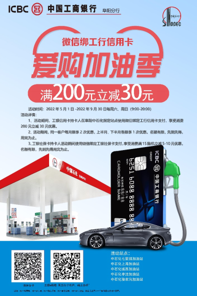 ![]() 愛購加油 2022年5月1日至2022年9月30日上午9點:00-晚20:00,微信綁定工行信用卡或e錢包在中國石化、中國石油指定門店消費,滿200元隨機立減30元。 ![]()