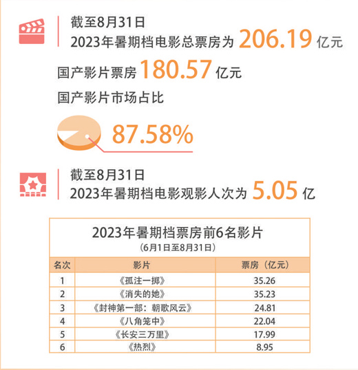 2023年中國(guó)電影暑期檔創(chuàng)造多項(xiàng)新紀(jì)錄。截至8月31日,該檔期總票房為206.19億元,創(chuàng)下暑期檔票房歷史新高;觀影人次為5.05億,創(chuàng)下歷年暑期檔觀影人次新高。今年暑期檔共上映約140部影片,供給豐富,呈現(xiàn)多樣化、多品種、多類型的態(tài)勢(shì),觀眾幾乎每周都有新選擇,不同群體都有適合其審美的影片。雖有多部進(jìn)口影片參與市場(chǎng)競(jìng)爭(zhēng),但國(guó)產(chǎn)電影領(lǐng)跑優(yōu)勢(shì)明顯,市場(chǎng)占比為87.58%,說(shuō)明觀眾對(duì)國(guó)產(chǎn)電影的信任度、滿意度在增加。這個(gè)暑期檔,《消失的她》《孤注一擲》兩部影片票房均超過(guò)35億元,《封神第一部:朝歌風(fēng)云》《八角籠中》兩部電影票房均超過(guò)20億元,《長(zhǎng)安三萬(wàn)里》票房近18億元,《熱烈》《我愛(ài)你!》等10余部影片票房超過(guò)億元。由此可以看出,中國(guó)電影的市場(chǎng)結(jié)構(gòu)更趨合理,可持續(xù)發(fā)展的基礎(chǔ)更加厚實(shí)。
