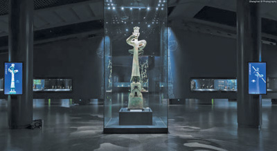 | 陳列展覽 三星堆博物館展出的青銅大立人,旁邊采用多媒體技術(shù)展示其服飾與造型解讀。 宋豪新 張 艷攝影報(bào)道 |