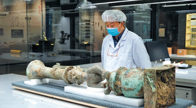 | 數(shù)字采集 考古人員在實(shí)驗(yàn)室,對(duì)三星堆出土文物進(jìn)行高光譜掃描。 廣漢市委宣傳部供圖 |
