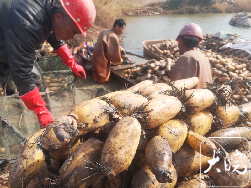 開欄語:又是一年新春將至。放眼江淮大地,多少新氣象、多少新變化,就發(fā)生在我們身邊。 到基層去,將鏡頭、筆觸直接延伸到社會(huì)生活的最前沿,用腳步丈量民情,用心靈感受民生。新安晚報(bào)、安徽網(wǎng)、大皖新聞從即日起推出《新春走基層》欄目,將推出最鮮活、最生動(dòng)、最感人的新聞報(bào)道,展現(xiàn)真實(shí)、全面、立體的安徽。 大皖新聞?dòng)?/strong> 新春將至,年味兒漸濃。安慶市宜秀區(qū)白澤湖鄉(xiāng)因大面積發(fā)展蔬菜產(chǎn)業(yè),被譽(yù)為安慶城區(qū)的“菜園子”。1月23日,室外天寒地凍,新安晚報(bào)、安徽網(wǎng)、大皖新聞?dòng)浾咦哌M(jìn)白澤湖鄉(xiāng),發(fā)現(xiàn)堅(jiān)守在蔬菜基地的菜農(nóng)們,為了城區(qū)市民“舌尖上的美味”,加班加點(diǎn)忙得熱火朝天。 “藕”遇大豐收,挖藕程序多是個(gè)技術(shù)活 23日下午,記者來到白澤湖鄉(xiāng)芭茅村600余畝淺水藕基地時(shí),發(fā)現(xiàn)荷桿在寒冬中雖然早已凋零,但基地里工作的村民臉上處處洋溢著豐收的喜悅。 找藕、挖藕、拔藕……藕田內(nèi),記者了解到挖藕程序多是個(gè)技術(shù)活,采藕工們正穿著防水靴,躬身將手伸入塘底的淤泥中,慢慢將淤泥刨開,順著蓮梗抓住蓮藕,再拉著蓮藕的莖小心翼翼地往上一提,一根新鮮的蓮藕就被挖了出來。最后,經(jīng)過高壓水槍的仔細(xì)沖洗,沾滿淤泥的蓮藕就會(huì)露出白嫩的“真顏”。 時(shí)下,蓮藕最肥碩、脆甜的時(shí)候。放眼望去,一條條雪白的蓮藕接二連三地浮出水面,一艘艘滿載蓮藕的船只向岸邊駛?cè)ィ豢鹂瘐r嫩的蓮藕被工人們裝進(jìn)貨車運(yùn)往大型農(nóng)貿(mào)市場(chǎng),豐富百姓的菜籃子。 芭茅村蓮藕基地負(fù)責(zé)人王小軍告訴記者, 現(xiàn)在訂單一天有10000多斤,工人一天挖藕五六千斤,市場(chǎng)賣一部分,自己加工藕粉加工一部分。2023年,芭茅村蓮藕產(chǎn)值預(yù)計(jì)可達(dá)200萬元,村集體增收20萬元。